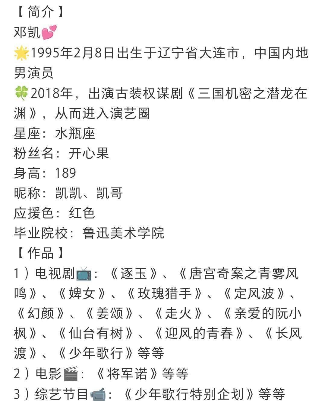 邓凯1995年2月8日出生于辽宁大连,毕业于鲁迅美术学院,中国内地影视男演员 。非科班出身的他为争取机会曾剃头试镜、拍摄短剧配角,甚至在寒冬拍摄落水戏导致身体受损。